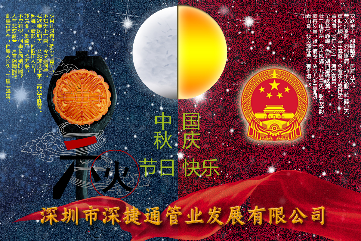 沒有多余的話語,只有滿滿的祝福!深圳市深捷通管業(yè)發(fā)展有限公司祝大家國慶中秋,雙節(jié)同慶。
