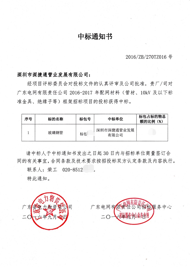 熱烈祝賀深捷通管業(yè)成為廣東電網(wǎng)2016-2017年度玻璃鋼管中標(biāo)單位!